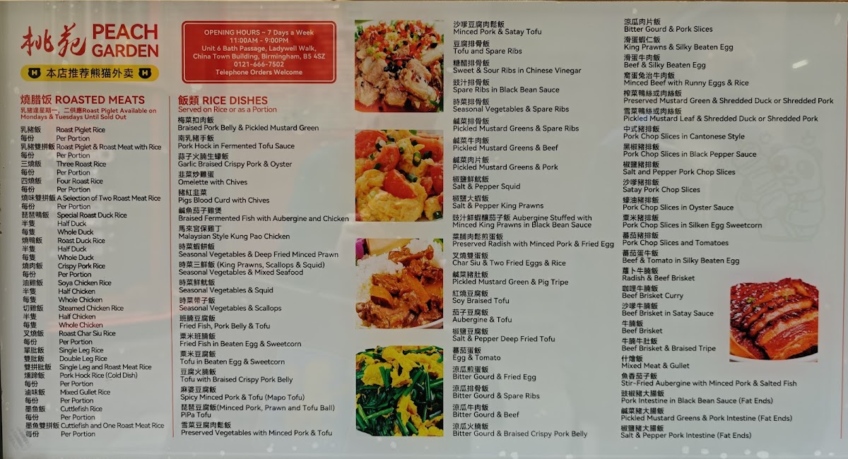 Welcome to Peach Garden, a hidden gem nestled in the heart of Birmingham at Unit 4-6 Bath Psge, Ladywell Walk, B5 4SZ. Known for its remarkable array of Cantonese-style cuisine, Peach Garden stands out for its focus on quality and flavor. Whether you're a fan of succulent roasted meats or looking for hearty vegetarian options, there's something here to satisfy every palate.